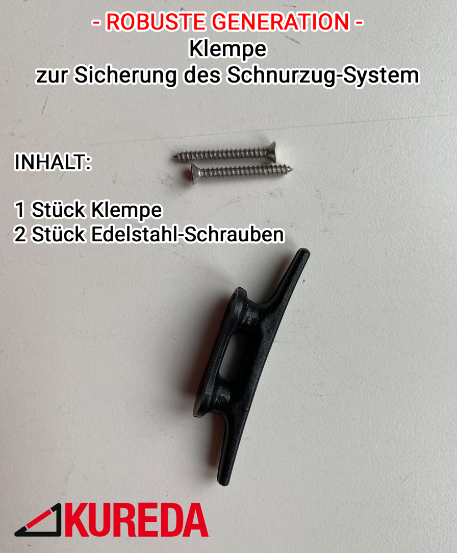 INFO: Bitte Montageanleitung beachten!!! ZUR SELBSTMONTAGE. Klempe zur Sicherung der Netzmarkise mit Schnurzug-System INHALT: